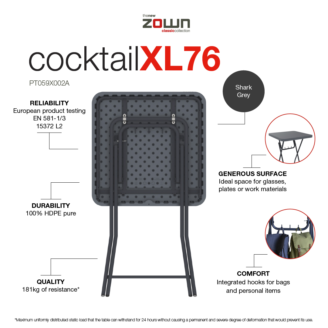 Hoher, quadratischer Klapptisch (76×76 cm) mit einer Höhe von 110 cm. Ideal für Cocktailpartys, Empfänge und Networking-Bereiche. Sein Design fördert eine bequeme und dynamische Interaktion zwischen den stehenden oder auf hohen Hockern ruhenden Gästen. Seine Haken für Taschen und persönliche Gegenstände sorgen darüber hinaus für besonderen Komfort und ein freies Umfeld.