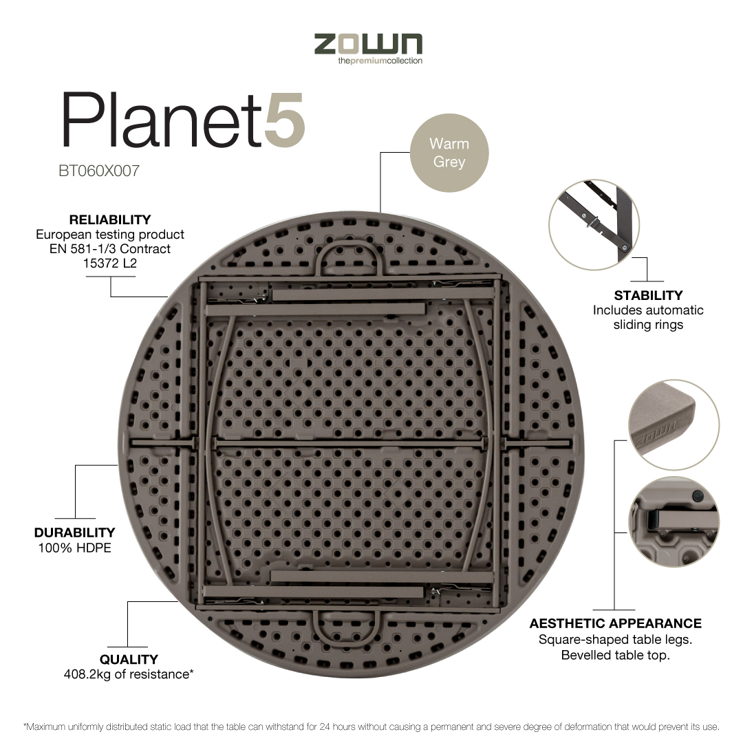 Faltbarer runder Tisch Ø152 cm für bis zu 8 Personen. Idealer Tisch für Bankette und Feiern. Die Struktur des Tisches wurde ohne Querstreben entworfen, um den Komfort für die Gäste zu erhöhen. Dank seiner Leichtigkeit und der Qualität der Tischplatte kann der Tisch leicht bewegt und gerollt werden, ohne zu brechen.