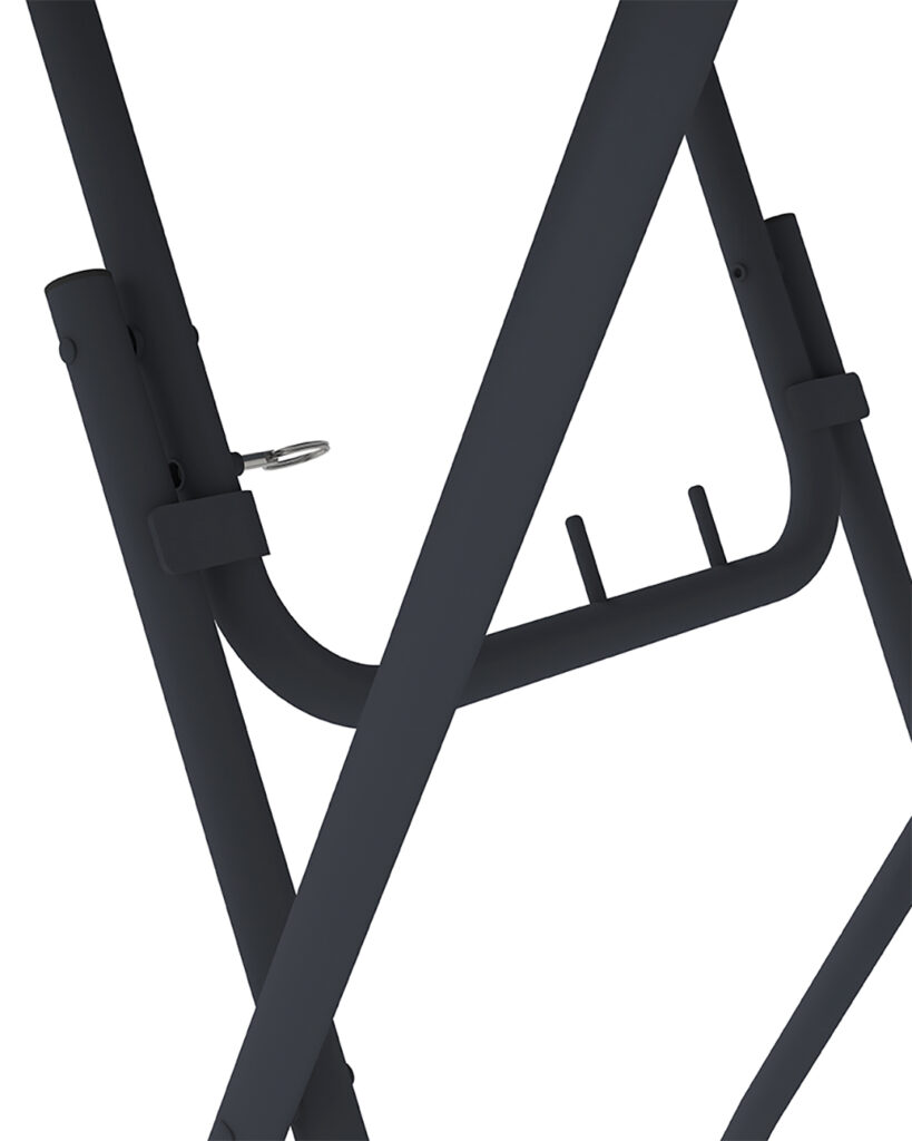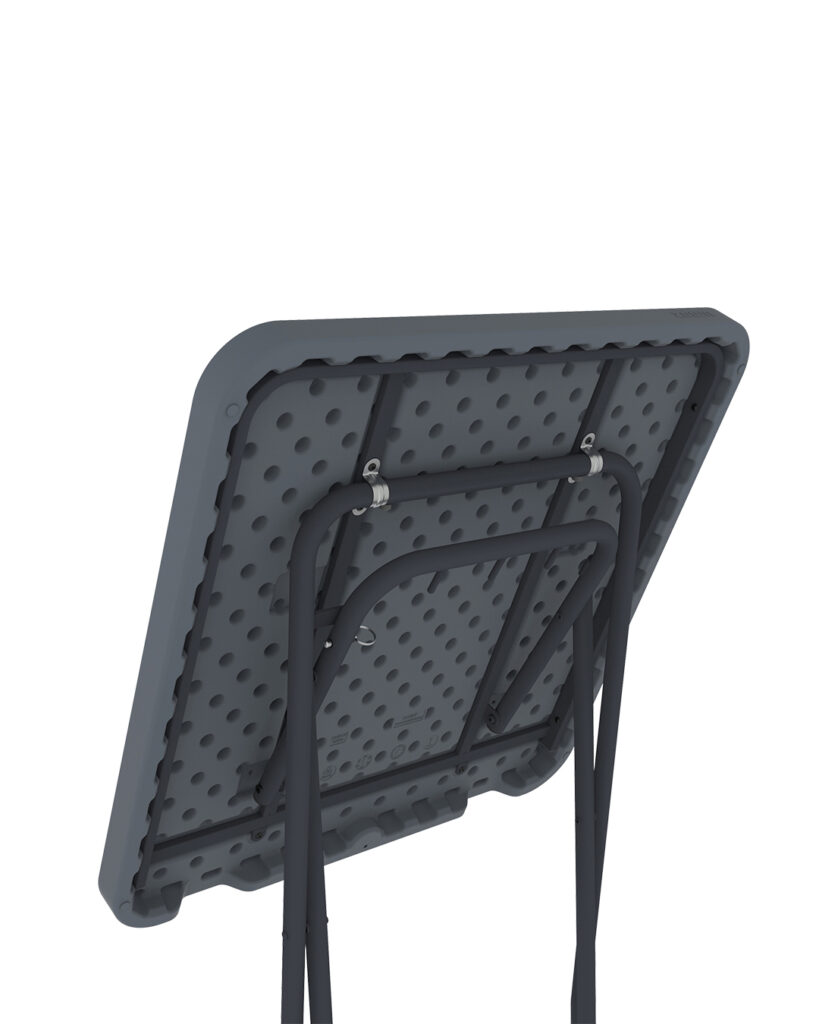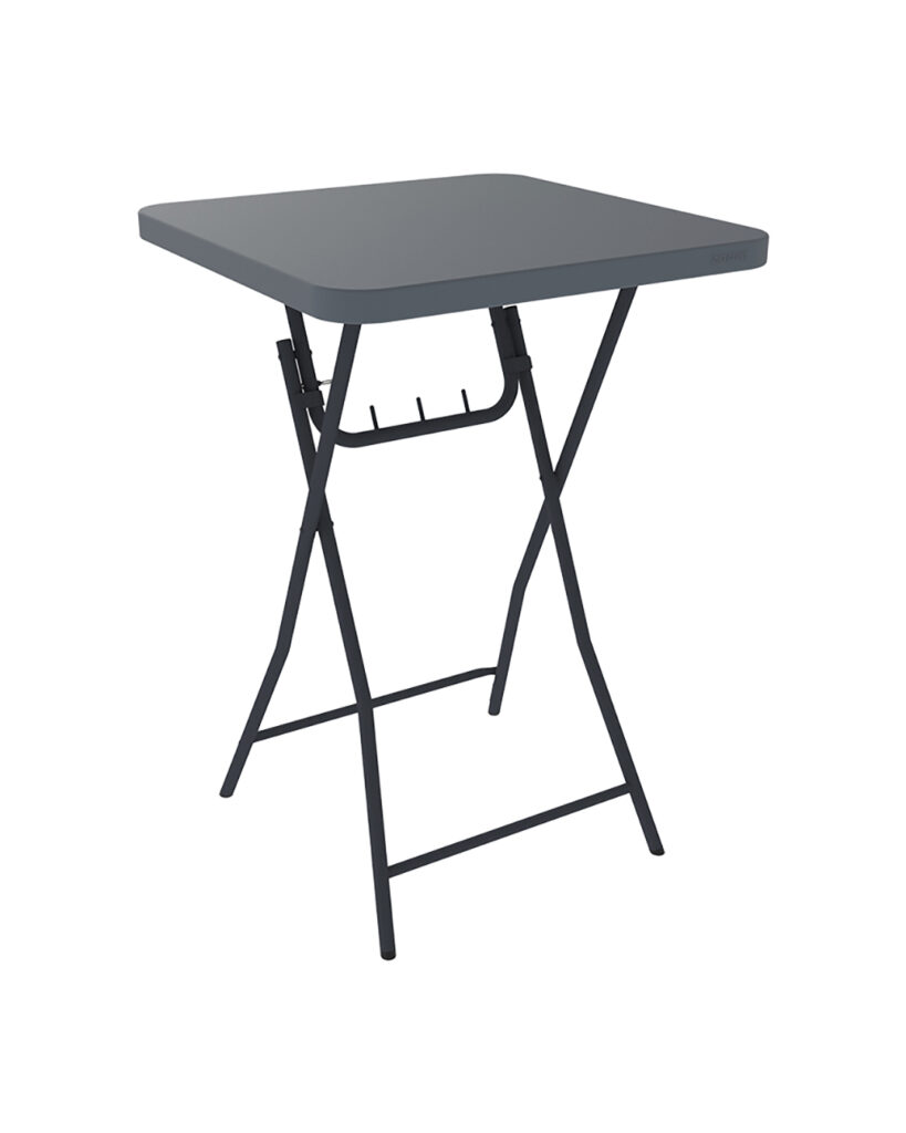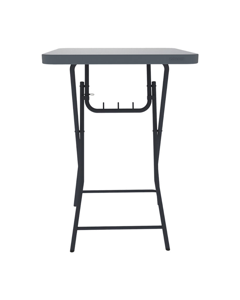 Mesa alta plegable de formato rectangular (122 × 61 cm) y 110 cm de altura. Ideal para cócteles, recepciones y zonas de networking: su superficie amplia ofrece espacio extra para copas, platos o material de trabajo, facilitando una interacción cómoda entre los asistentes, tanto de pie como con taburetes altos. Además, incorpora colgadores para bolsos y objetos personales, aportando un plus de practicidad y confort.
