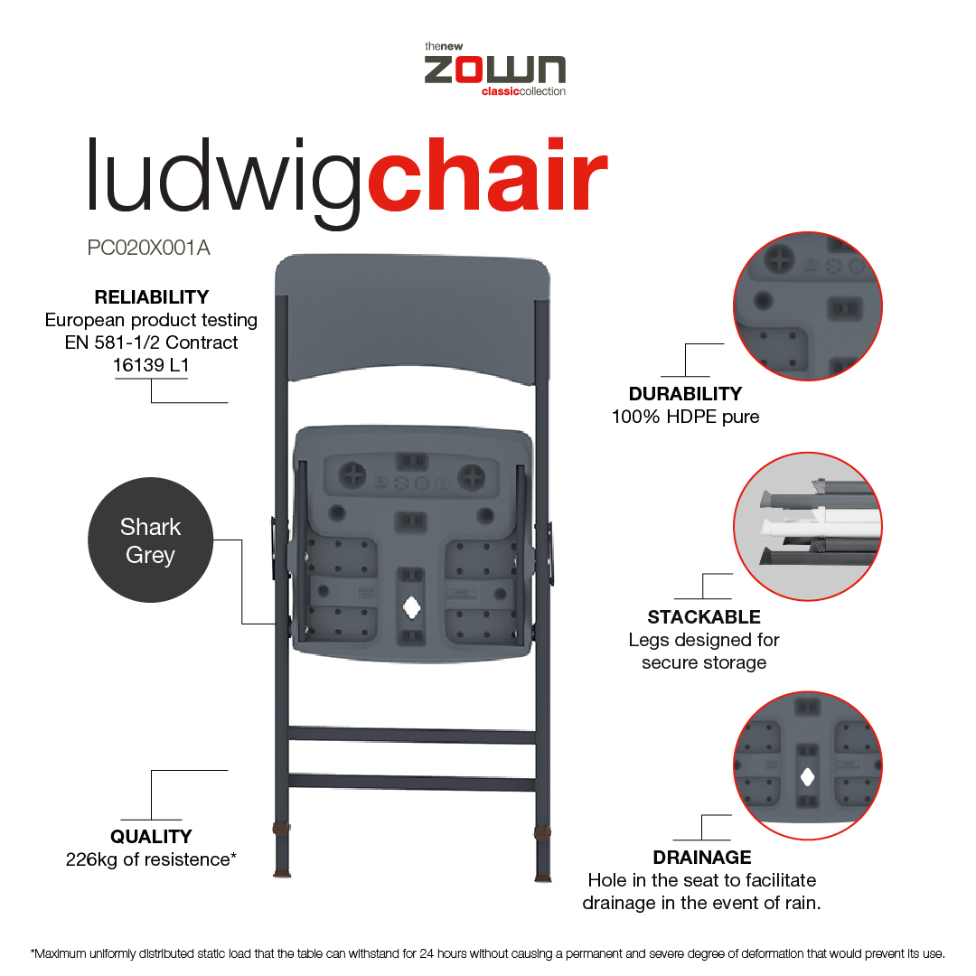 | Ludwig chair grey | PC020X001A-SG | 8435768209433 | 47.2x53.5x83.7 cm / 18.58x21.06x32.95" | 1 persona | 226 kg / 500 lb | 3.8 kg / 8.37 lb | Polietileno de alta densidad 100% puro | Download |