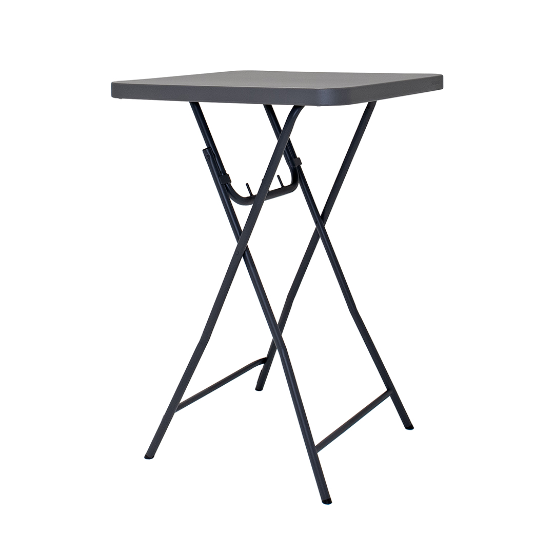 Table haute pliante carrée (76 cm de côté) avec une hauteur de 110 cm. Idéale pour l’organisation de cocktails, de réceptions et d’évènements de réseautage : son design permet des échanges confortables et dynamiques entre les personnes présentes, qu’elles soient debout ou assises sur de hauts tabourets. Elle comprend également des crochets de suspension pour les sacs et les effets personnels, ce qui augmente le confort en libérant de l’espace.