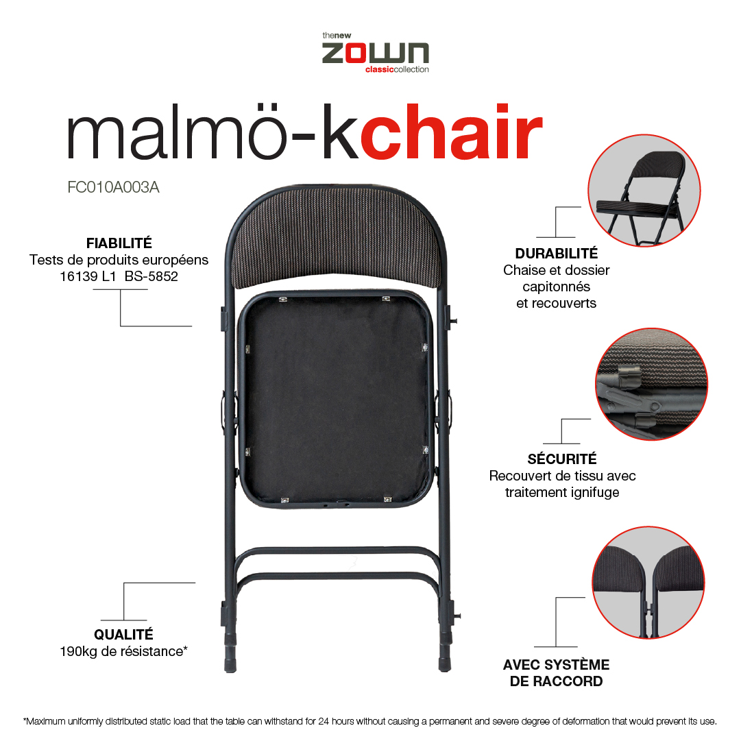 Chaise pliante rembourrée et tapissée pour une utilisation en intérieur lors de conférences, pour salles de réunion, actes et événements corporatifs. Avec système d’assemblage. Fortement recommandé pour les climats froids.
