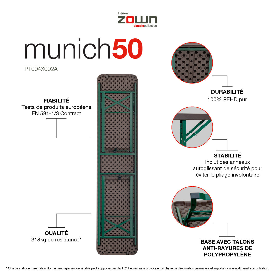Table brasserie pliante 220 x 50 cm. Pieds avec patins qui empêchent la table de s’enfoncer sur un sol mou (herbe, sable…). Elle peut également être utilisée sur des sols durs (béton, terrazzo ou parquet) grâce aux talons anti-rayures incorporés dans la base. Idéal pour les fêtes populaires, les événements avec des food trucks, les festivals.