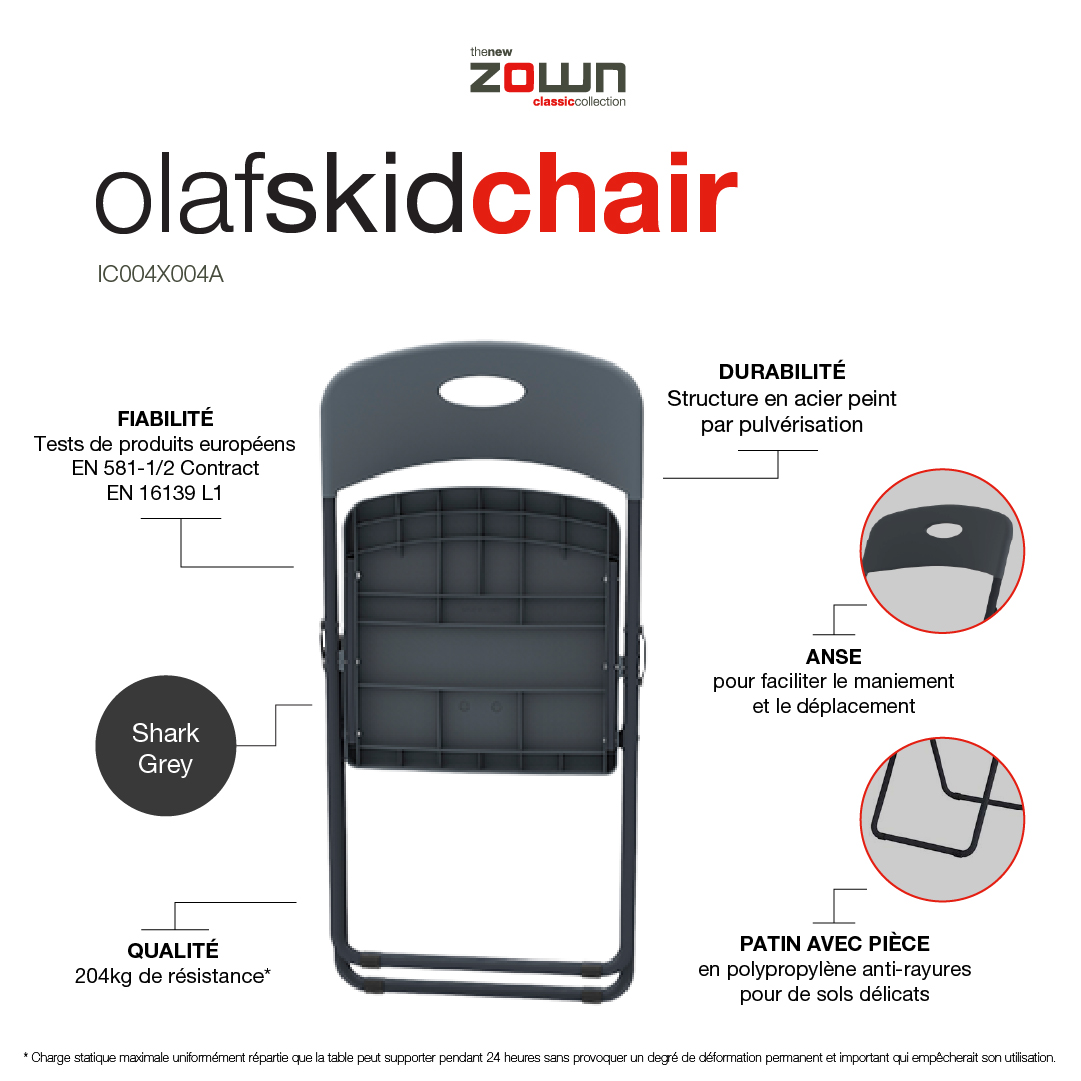 Chaise pliante avec assise et dossier en polypropylène. Structure à patins spécialement conçue pour éviter que la chaise ne s’enfonce dans un sol meuble tel que l’herbe ou le sable. Chaise très légère, facile à manipuler et à ranger. Dossier avec poignée. Idéal pour les événements, les célébrations et les actes qui nécessitent de l’agilité dans le montage et le démontage. Disponible en blanc, noir et gris foncé.