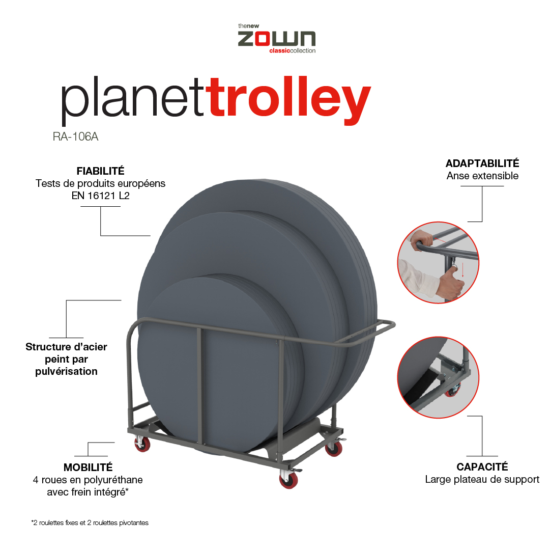 Chariot pour ranger et transporter les tables rondes Zown. Poignée extensible pour l’adapter au diamètre des tables. Convient aux tables : Planet120, Planet150, Planet160, Planet180, Planet4, Planet5 et Planet6.