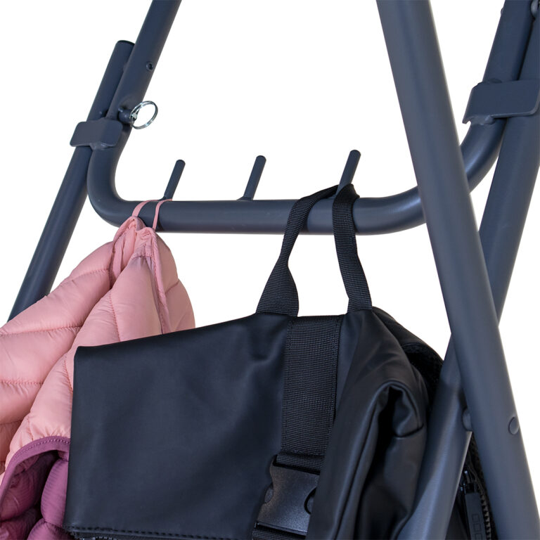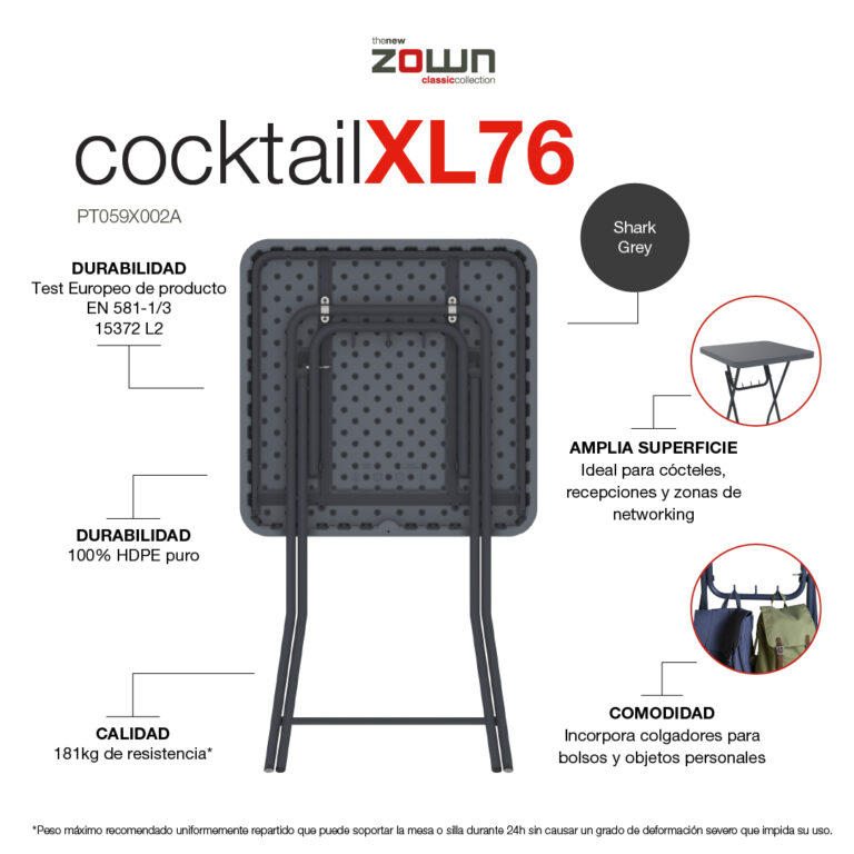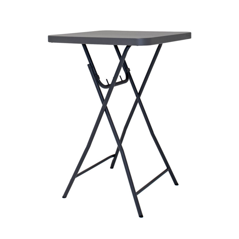 Table haute pliante carrée (76 cm de côté) avec une hauteur de 110 cm. Idéale pour l’organisation de cocktails, de réceptions et d’évènements de réseautage : son design permet des échanges confortables et dynamiques entre les personnes présentes, qu’elles soient debout ou assises sur de hauts tabourets. Elle comprend également des crochets de suspension pour les sacs et les effets personnels, ce qui augmente le confort en libérant de l’espace