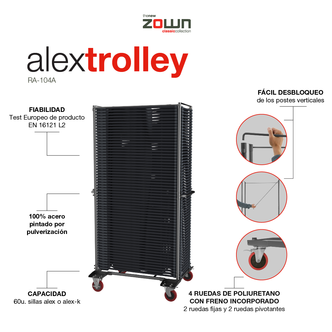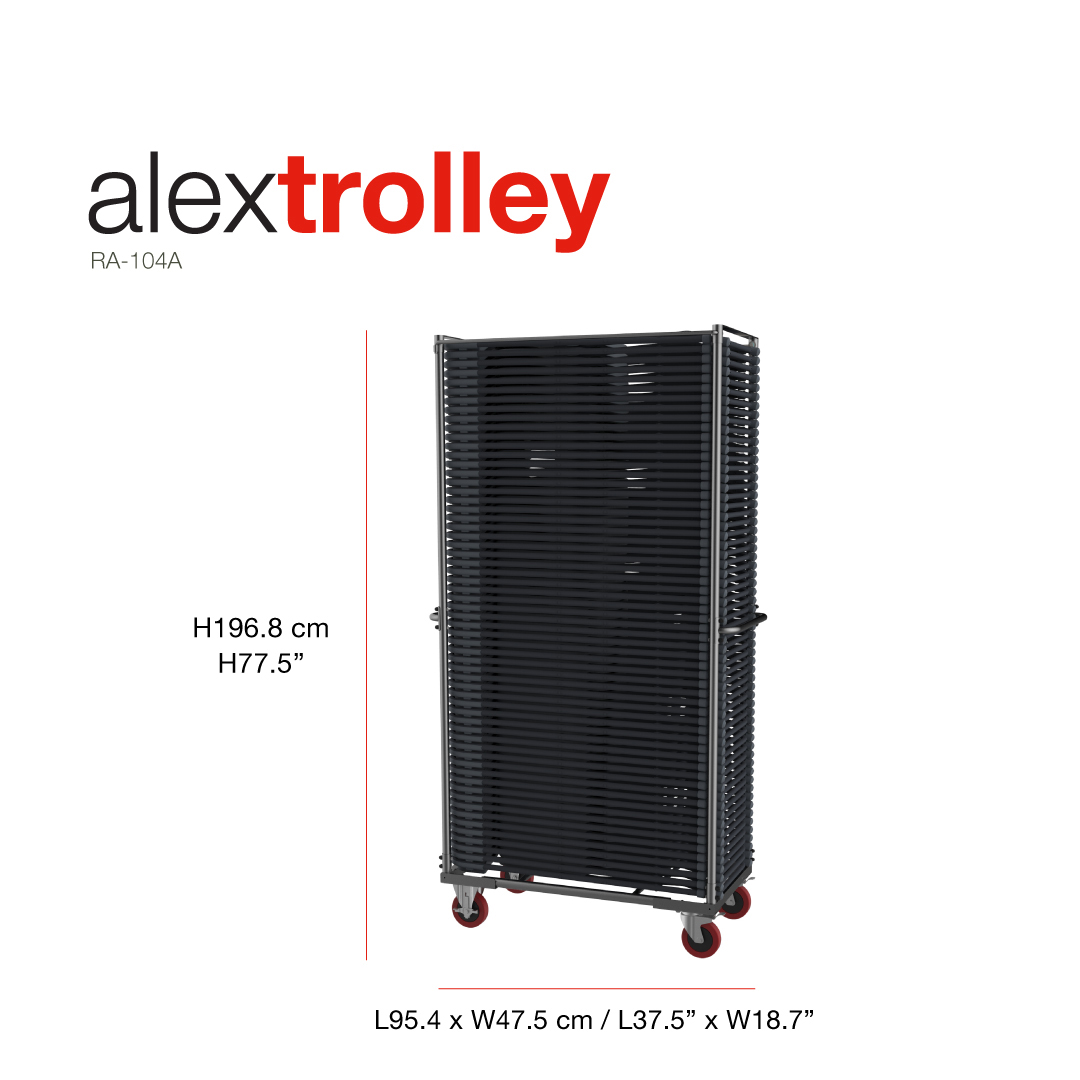 | Alextrolley | 95.4×47.5×196.8 cm / 37.5×18.7×77.5″ | 60 sillas alex o alex-k | 170 kg / 375 lb | 18.13 kg / 39.96 lb | RA-104A | Descargar |