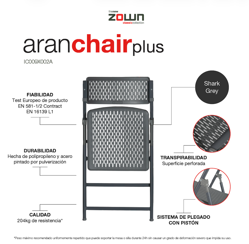 Silla plegable con asiento y respaldo de polipropileno inyectado en forma de malla ligeramente flexible y ergonómica que se adapta al cuerpo. Además, la superficie perforada le confiere transpirabilidad y facilita el drenaje en caso de lluvia. Plegado de la silla con pistón que aporta mayor seguridad y evita puntos de enganche. Muy confortable, ligera y fácil de almacenar. Ideal para eventos, celebraciones y actos que requieren agilidad en el montaje y desmontaje. Disponible en color blanco, negro, gris cálido y gris.