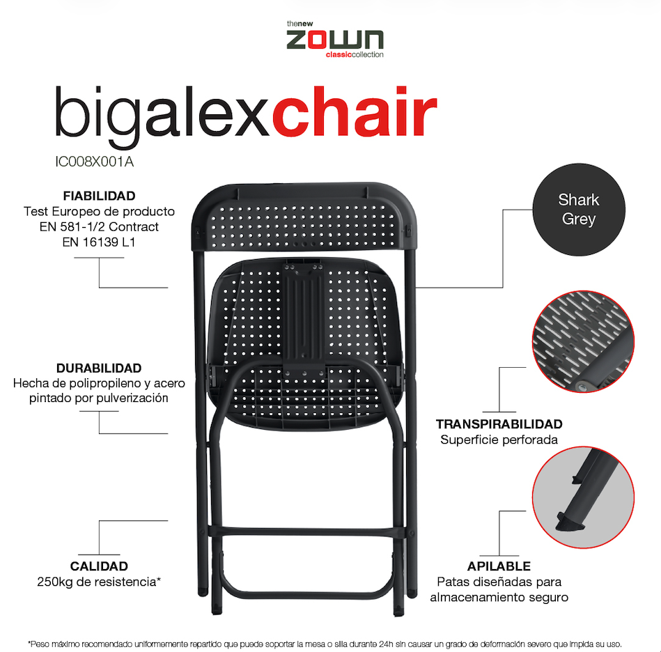 Silla plegable con asiento y respaldo de polipropileno inyectado. La superficie perforada le confiere transpirabilidad y facilita el drenaje en caso de lluvia. Muy amplia, ligera y fácil de almacenar. Ideal para eventos, celebraciones y actos que requieren agilidad en el montaje y desmontaje. Disponible en color blanco, negro, gris cálido y gris oscuro.