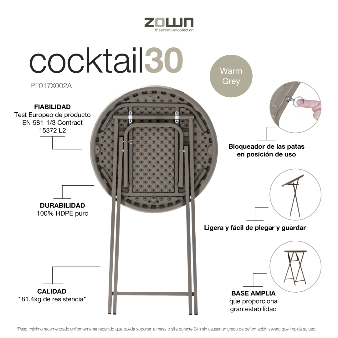 Mesa alta plegable redonda de Ø76 cm para cóctel o aperitivo (H110 cm) en celebraciones, eventos o convenciones. Para aquellos eventos en los que se busca una interacción fluida entre los usuarios, que están de pie o descansan/se apoyan en taburetes altos.
