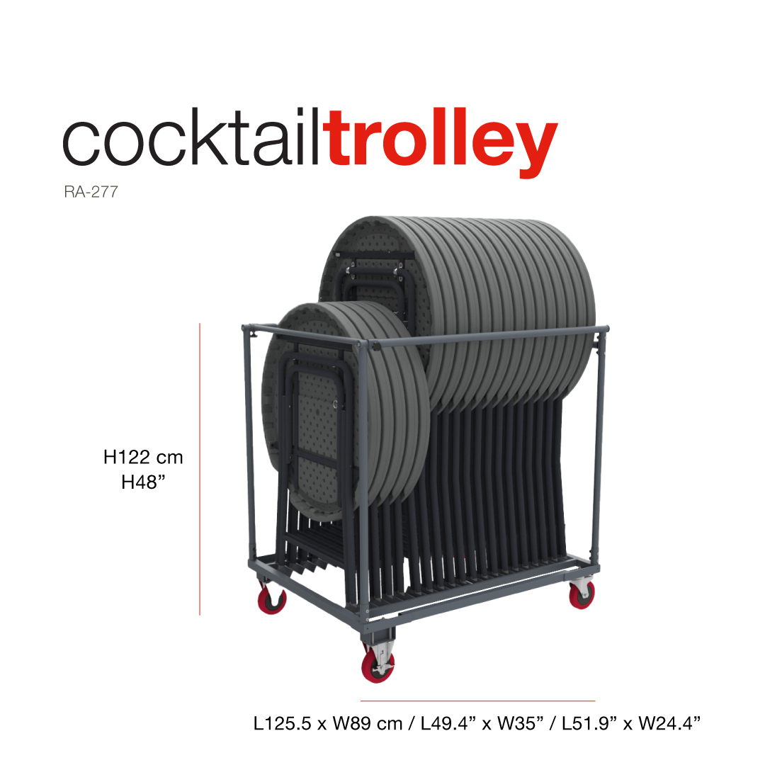 | Cocktailtrolley | 121x89x101 cm / 47.6x35x39.6″ | 20 mesas Cocktail80, Cocktail80, Praxis80 o Bistrot70 | 24 kg / 52.9 lb | RA-277 | Descargar |