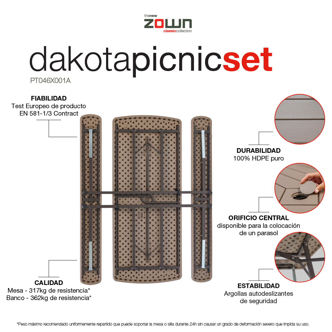 Set de una sola pieza de mesa (183 x 76 cm) con 2 bancos. Sobre texturizado con efecto madera. Resistente y fácil de guardar al final de la temporada. Ideal para espacios exteriores como jardines, parques de atracciones o cafeterías.