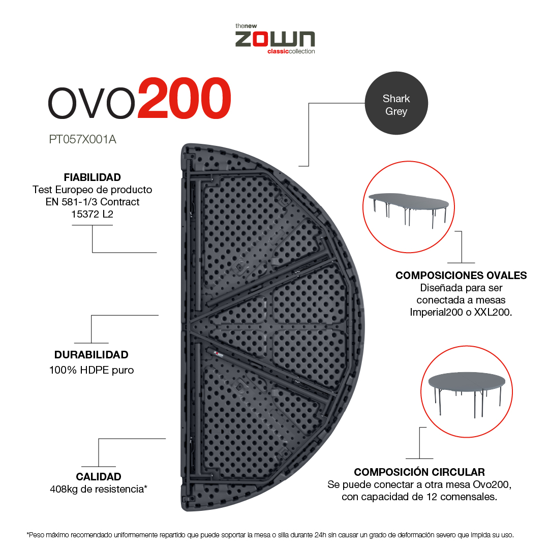 Mesa semicircular de 200 x 100 cm con capacidad para 6 comensales. Diseñada para unirse con las mesas Imperial200 o XXL200, permite crear composiciones ovaladas. Las composiciones ovaladas son ideales para aumentar el número total de comensales más allá del aforo máximo de las mesas redondas Planet180 (10 personas) o Planet200 (12 personas). Se integran perfectamente en eventos planificados con mesas redondas, ofreciendo una gran flexibilidad a los diseñadores de eventos y facilitando la asignación de comensales a cada mesa. Además, se puede unir con otra mesa Ovo200, formando una configuración circular de 200 cm de diámetro con capacidad para 12 comensales.